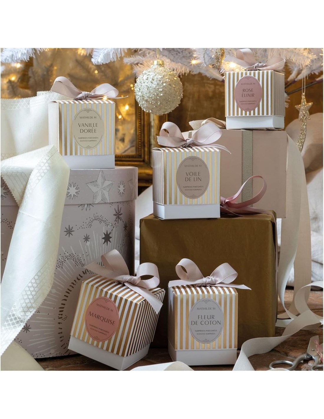 Submergeix-te en Flor de Cotó, un aroma suau i envoltant nascut de la fusió de flors blanques, cotó i fusta preciosa. Aquest elegant estuche de ratlles daurades Les Intemporelles Sorpreses Perfumades inclou una decoració de guix perfumat feta a mà i un concentrat de perfum de 4 ml per reaplicar infinitament l’aroma. Perfecte per perfumar delicadament tots els petits espais de la llar, com armaris, calaixos o equipatge.