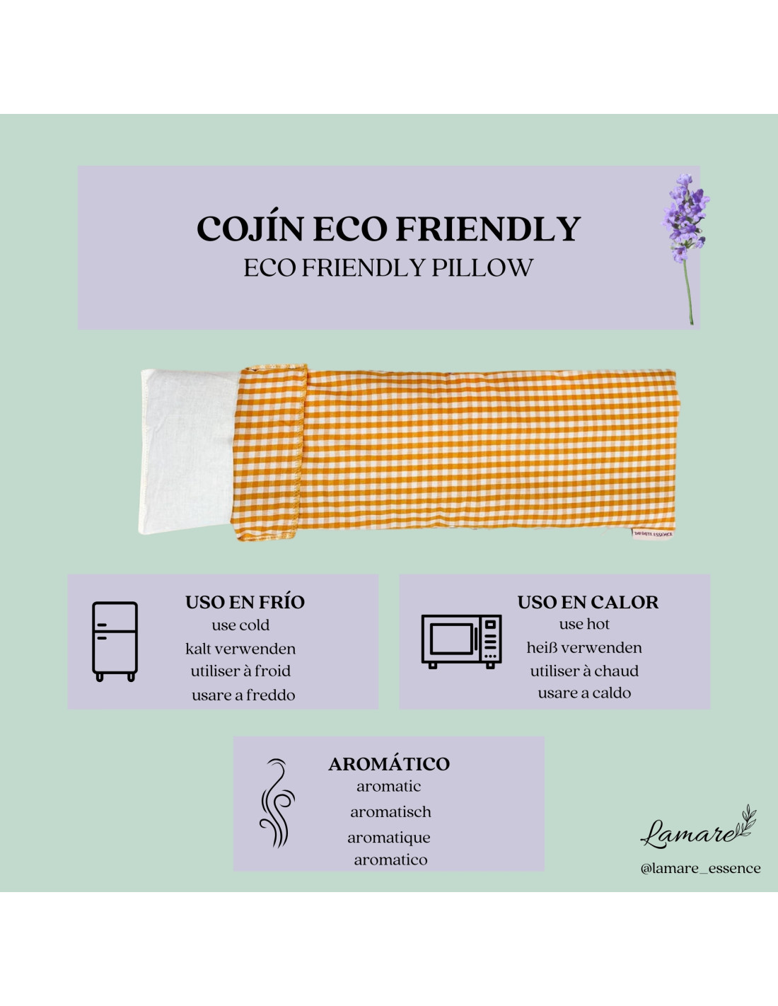 Heating pad made in Spain, filled with organic wheat seeds and premium lavender from Provence. Designed to relieve eye discomfort, promote relaxation, and enhance wellbeing through hot and cold therapies. Features a removable, washable 100% cotton cover. Ideal for migraines, muscle pain, and eye fatigue. Presented in an elegant box, perfect as a gift.