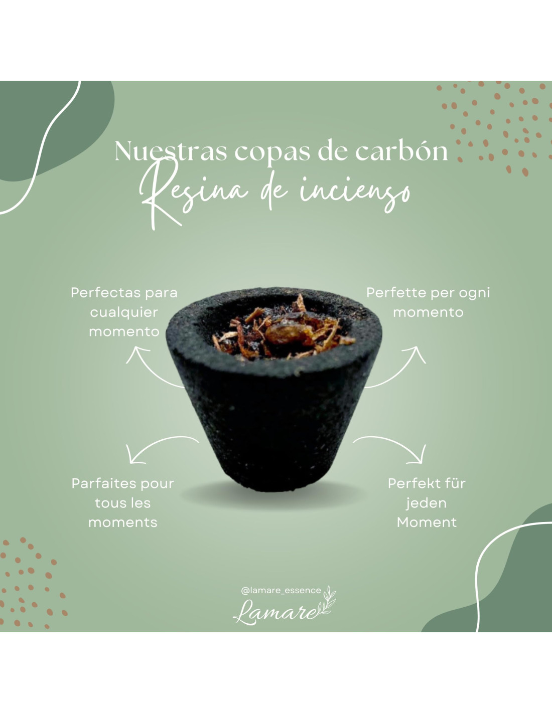 Heat the edges of the cup and let the charcoal and resin burn slowly. Place it in a well-ventilated area and enjoy its aroma for hours. Ideal for meditation, yoga sessions, or as a complement to a tranquil home environment.