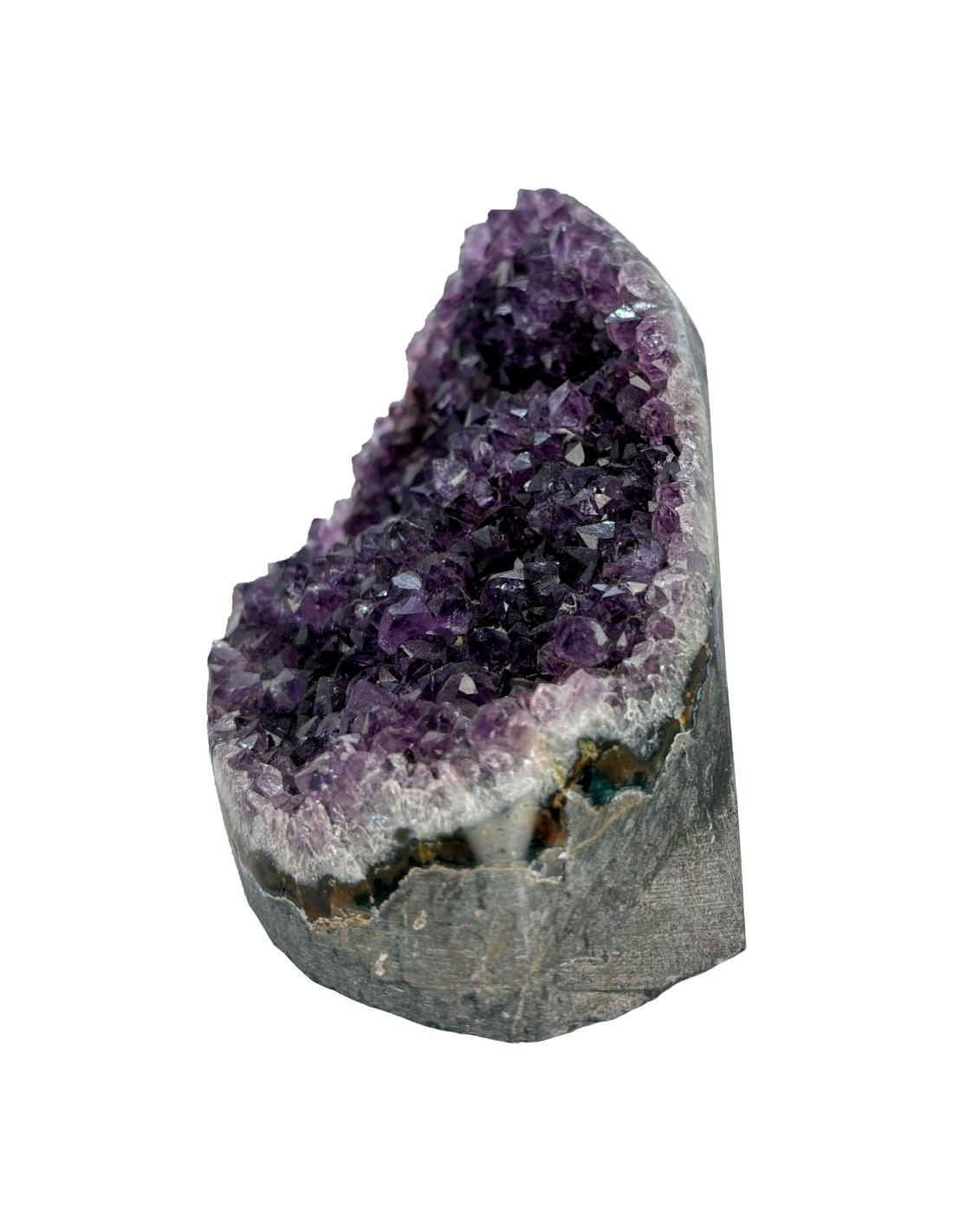 Drusa de amatista originaria de Uruguay, con cristales brillantes que recubren una base natural de basalto. Esta pieza única destaca por su belleza y singularidad, siendo perfecta para coleccionistas y decoración.
