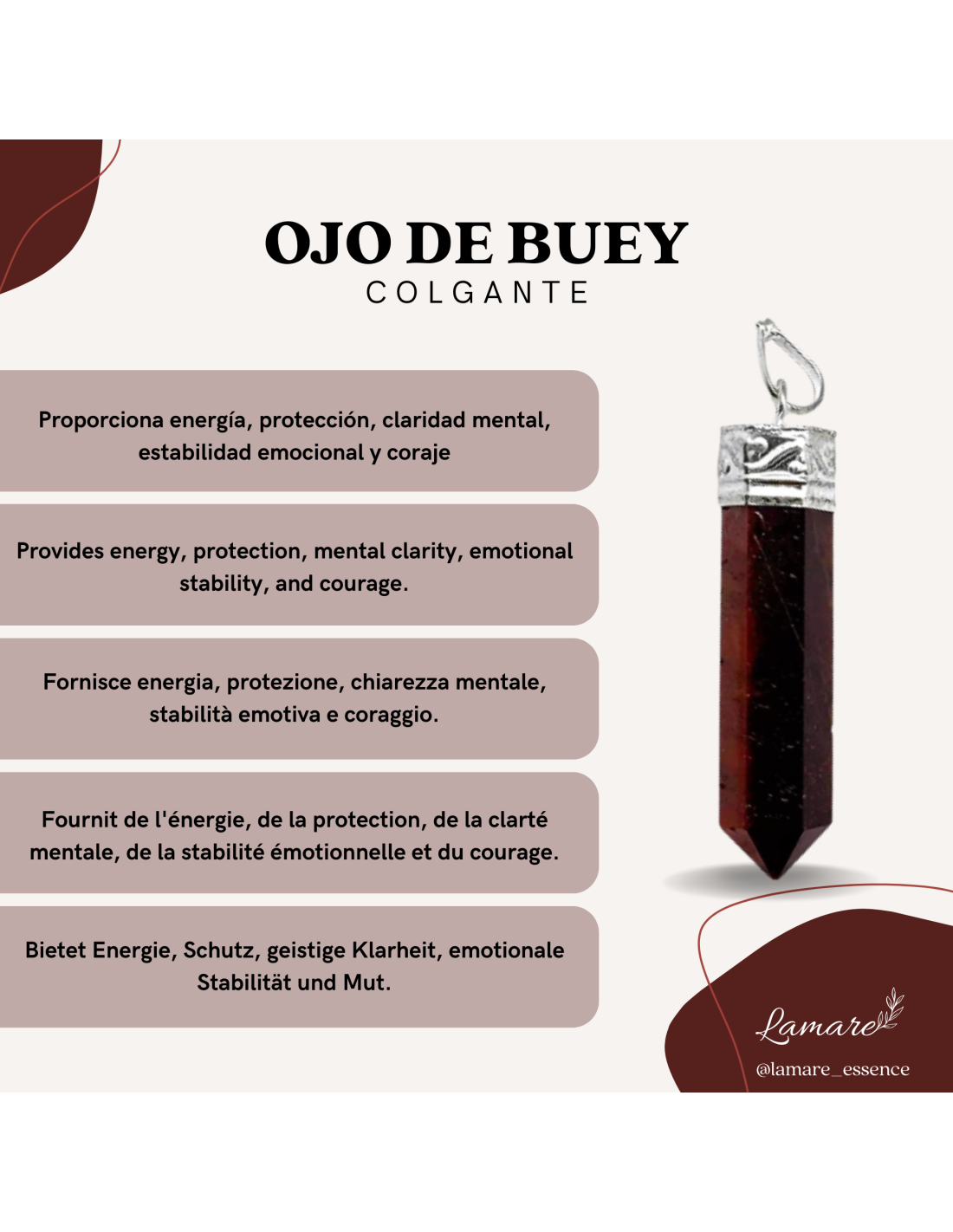 Este colgante de punta de Ojo de Buey es una pieza artesanal única elaborada a mano en piedra natural. Con un diseño elegante y rústico, destaca por sus tonos cálidos marrón-rojizos y su poder energético. Engarzado en cobre chapado en plata, cada colgante es exclusivo en forma y tamaño, ideal para quienes buscan equilibrio emocional, confianza y protección energética.