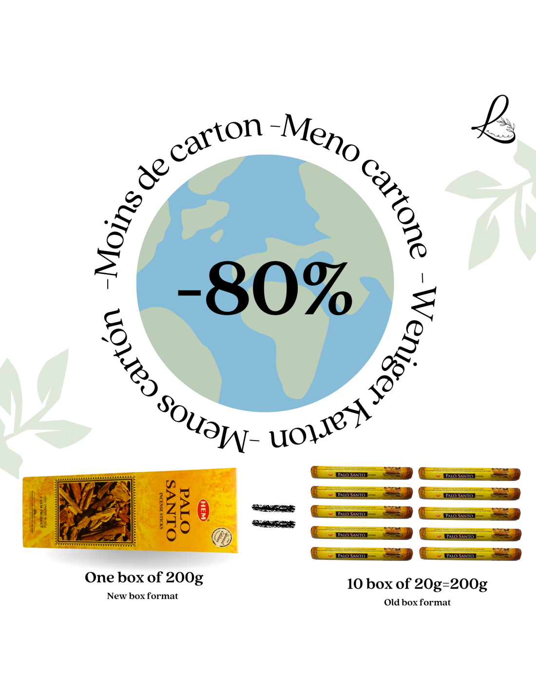 Varillas de incienso HEM Palo Santo en caja de 200 g (160-180 varillas). Con este formato reducimos el uso de cartón en un 86%, pasando de 10 cajas a 1, fomentando la sostenibilidad. Producto vegano, no testado en animales, sin explotación infantil y fabricado con materiales reciclados.