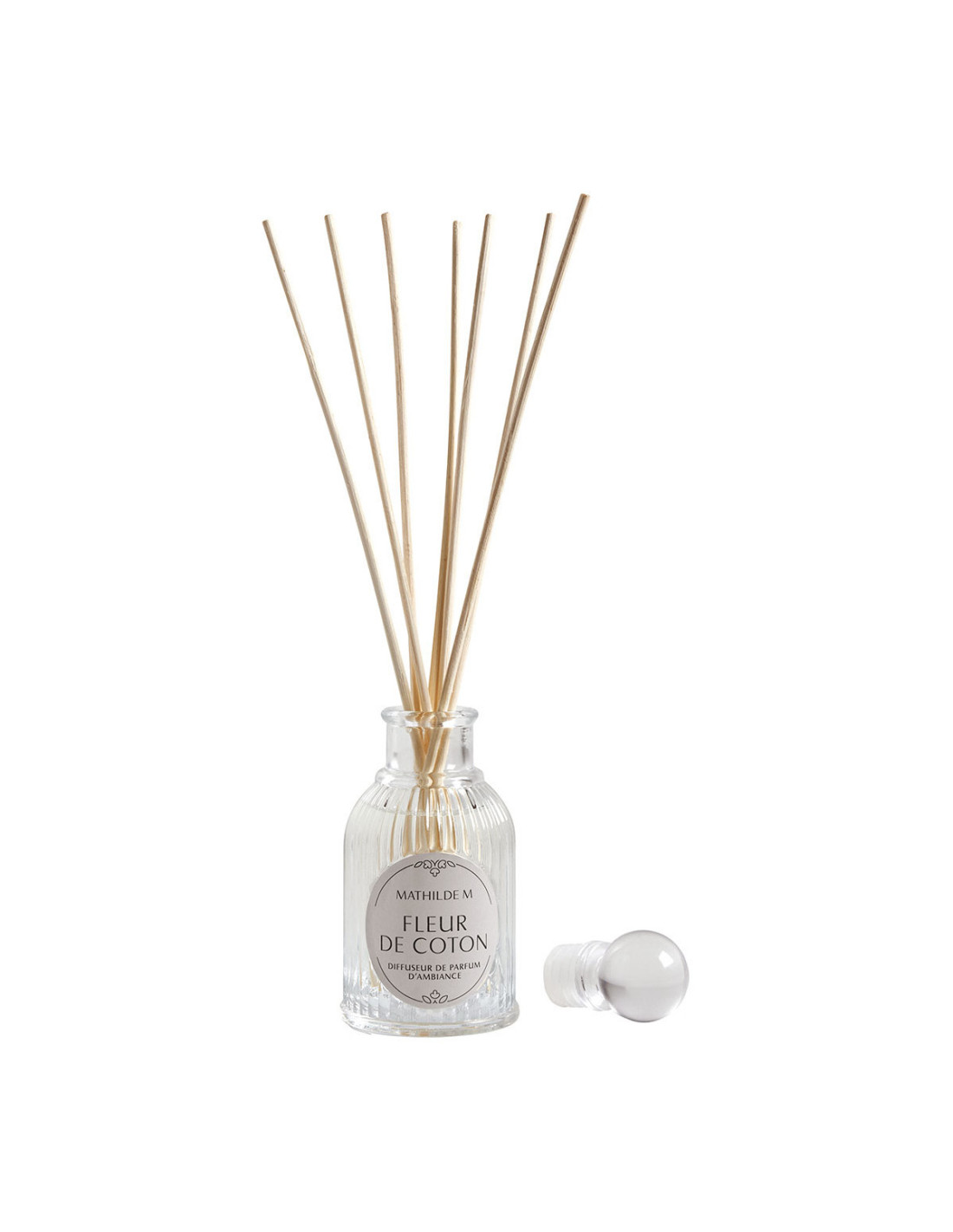 Difusor Les Intemporelles - Fleur de Coton con aroma suave y fresco que combina flores blancas, algodón y maderas preciosas. Difusión continua mediante 7 varillas de ratán natural de 20 cm en frasco de vidrio acanalado de 90 ml. Ideal para perfumar habitaciones medianas durante semanas. Incluye tapón para detener la difusión.