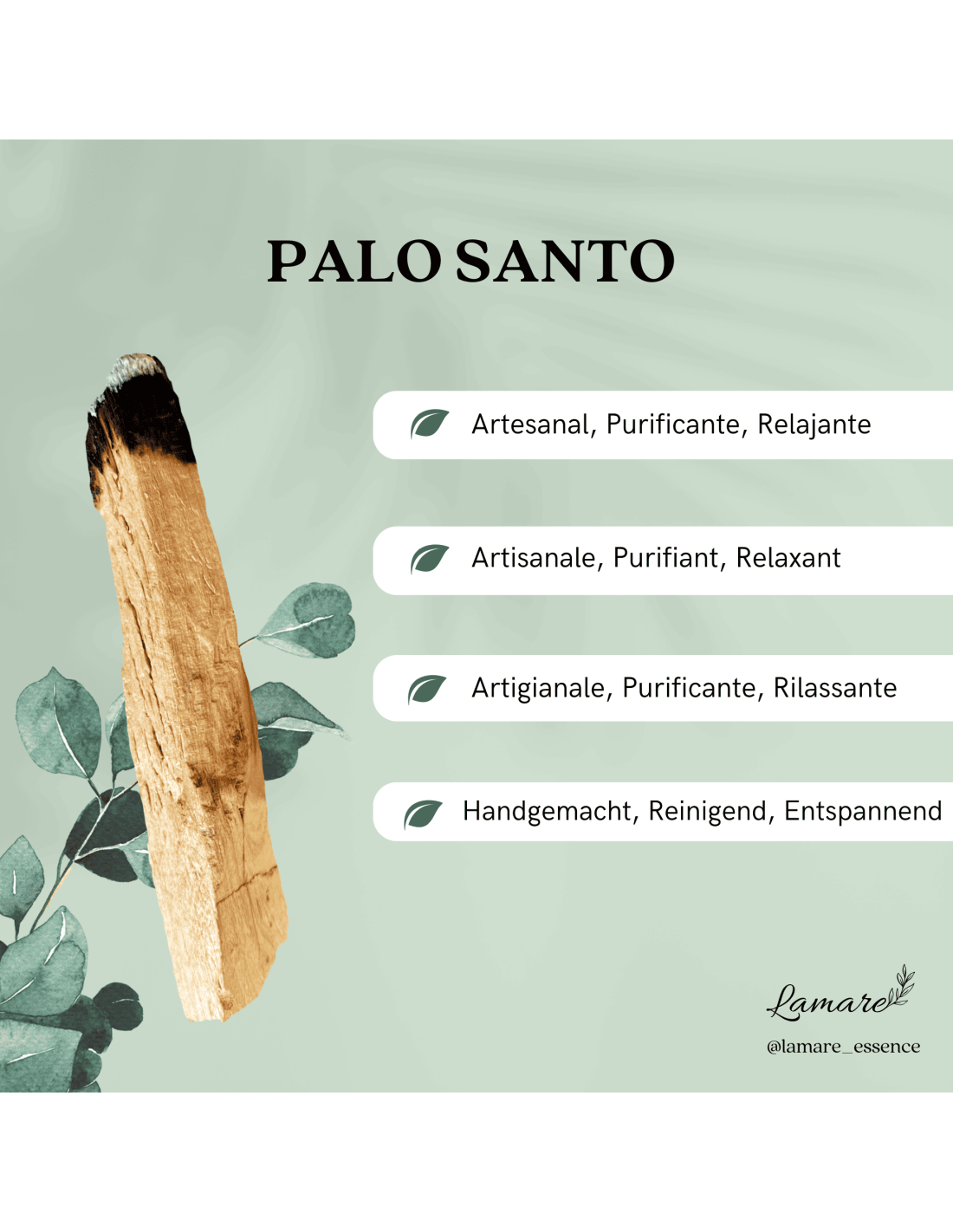 - 4 Sticks de Palo Santo: Conocido por su aroma suave y amaderado, el Palo Santo es ideal para atraer energía positiva y crear un entorno espiritual.